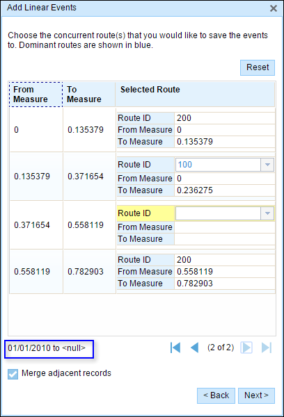 The From Measure and To Measure columns show the values for each section of the chosen route from the previous pane. The From Measure and To Measure boxes under Route ID show the value for each dominant route where the events will be added.